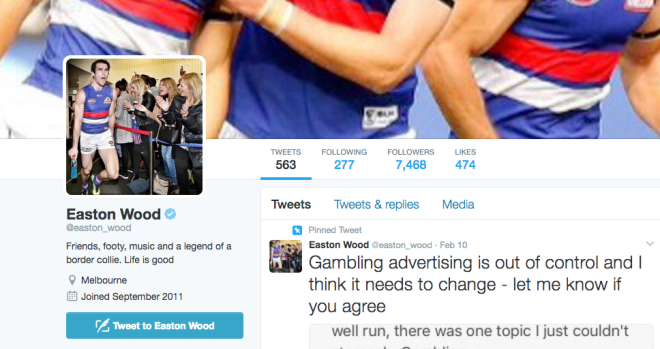 Western Bulldogs AFL star Easton Wood, used his considerable notoriety in the league (fresh off being a Premiership captain, and now co-host of the new AFLW television program) to send a message via his Twitter account about his objection to gambling advertising.